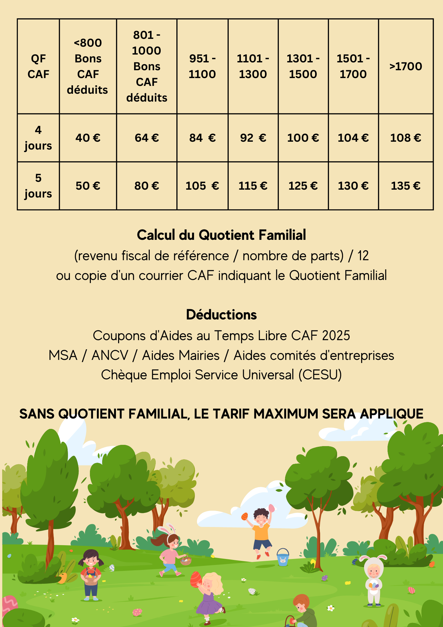 Le tarif sera calculé en fonction de votre Quotient Familial.