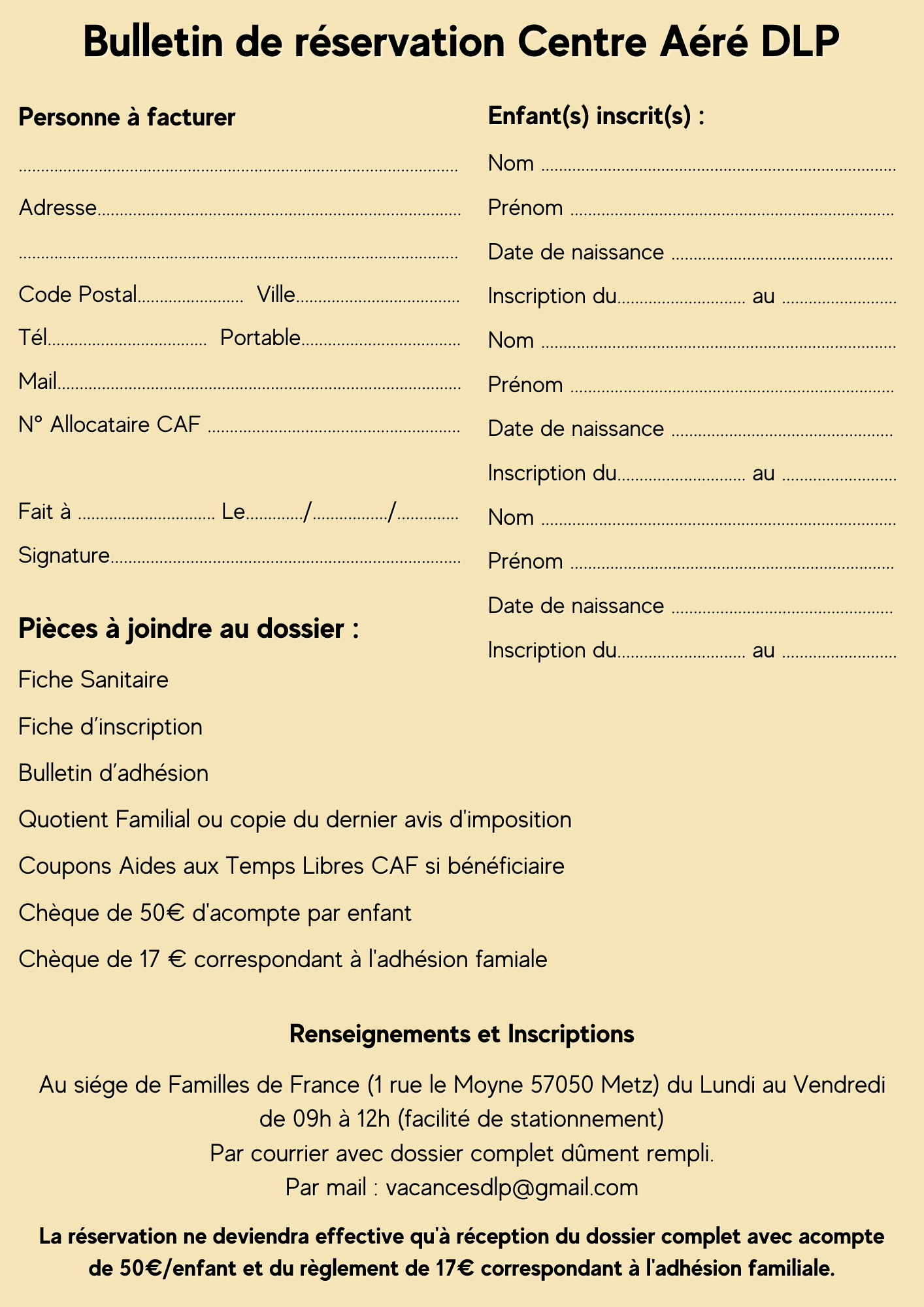 Pour toute inscription, nous vous remercions de nous retourner le dossier complet (à nos bureaux ou par mail à famille-france@wanadoo.fr) :